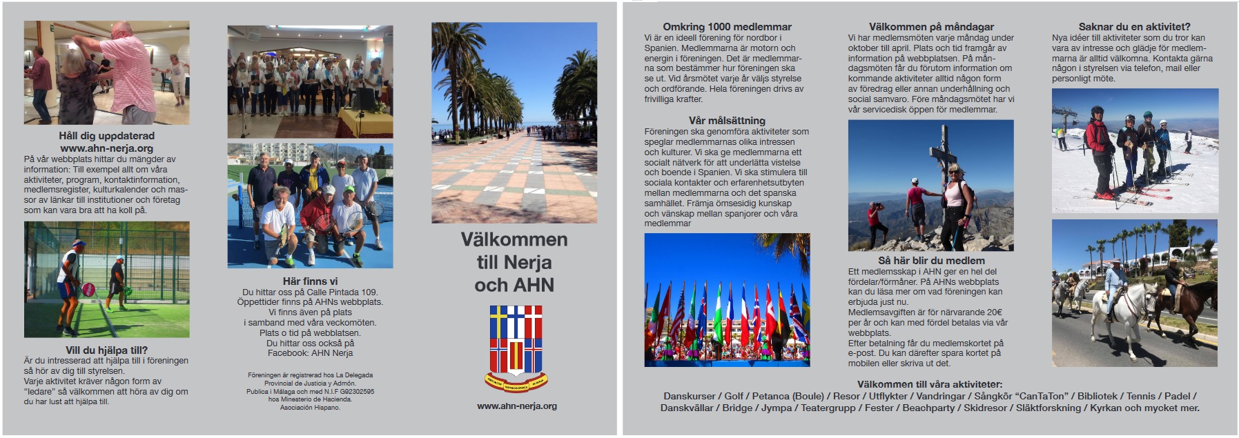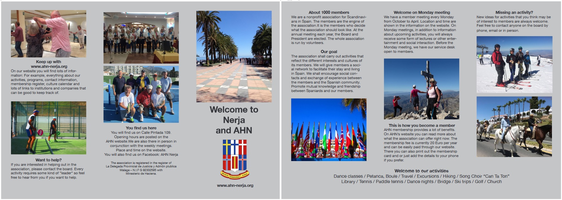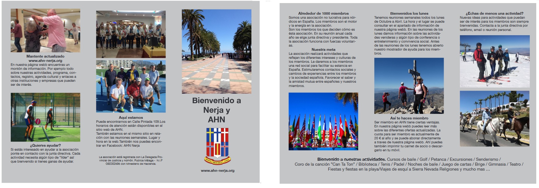 AHN - Asociación Hispano NórdicaFöreningen startades redan 1968 och hade till syfte att bli en organisation som skulle hjälpa Nordbor med information och goda råd gällande förhållanden i Spanien. AHN blev också en naturlig social och kulturell mötesplats för många nordbor som vistades i Sydspanien under vinterhalvåret. Detta är fortfarande grundpelarna i AHNs verksamhet.AHN har sex lokalföreningar på Costa del Sol. De är från väst till öst (klicka på namnet för mer info):•Nueva Andalucía•Marbella•Fuengirola-Mijas•Torremolinos•Nerja•AlmuñécarEfter att i många år varit en relativt centralstyrd organisation har ledningen av verksamheten idag helt och hållet decentraliserats ut till de olika lokalföreningarna. Idag är dessa självstyrande och dess styrelse och medlemmar utvecklar aktiviteterna i egen riktning.I AHN Nerjas stadgar formuleras dess målsättning och arbetssätt som följer:“Föreningens mål är att i Nerja med omnejd:a.Genomföra aktiviteter inom medlemmarnas intresseområden för att spegla olika kulturer och främja sociala kontakter.b.Informera medlemmarna och stimulera erfarenhetsutbyte.c.Främja ömsesidig kunskap och vänskap mellan spanjorer och nordbor.d.Ge medlemmarna ett socialt och officiellt kontaktnät för att underlätta bosättning och vistelse i Spanien.För att uppnå dessa mål ska föreningen:a.Arrangera schemalagda medlemsmöten för samtliga medlemmar.b.Erbjuda ett aktivitetsprogram innehållande de aktiviteter som styrelsen bedömer ligga inom medlemmarnas intresseområden.c.Säkerställa att god information ges till medlemmarna genom användande av tillgängliga kanaler.”Förutom veckosmöten under vintersäsongen där god information och rådgivning blandas med underhållning, så erbjuds medlemmarna även ett brett aktivitetsprogram. Med undantag för söndagar så sker nästan alltid minst en AHN-aktivitet varje dag. Programmet är varierat och utformat med den baktanke att det ska kunna ge varje medlem ett antal möjligheter till sysselsättning.AHN-Nerjas säsong startar i början av oktober och avslutas normalt under de första två veckorna i april.Är man medlem i AHN har man alla möjligheter att leva ett aktivt liv i Sydspanien och få kontakter med Skandinaver boende i ditt närområde. Du erbjuds också löpande värdefull information om förhållanden som berör din situation som Utlandsskandinav i Spanien.AHN Nerjas informationsbroschyr Här finner du vår senaste informationsbroschyr på tre olika språk:•Svenska•Spanska•Engelska
